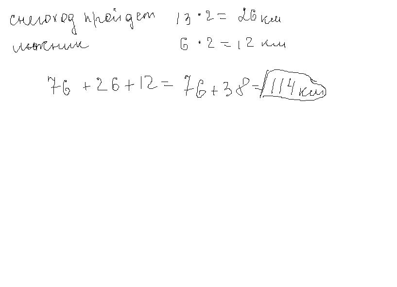 Из двух полярных стоянок, расстояние между которыми 76км, одновременно в противоположные стороны направились снегоход и лыжник. Скорость снегохода ровна 13км/ч а скорость лыжника 6км/ч. Какое расстояние будет между снегоходом и лыжником через 2 часа?