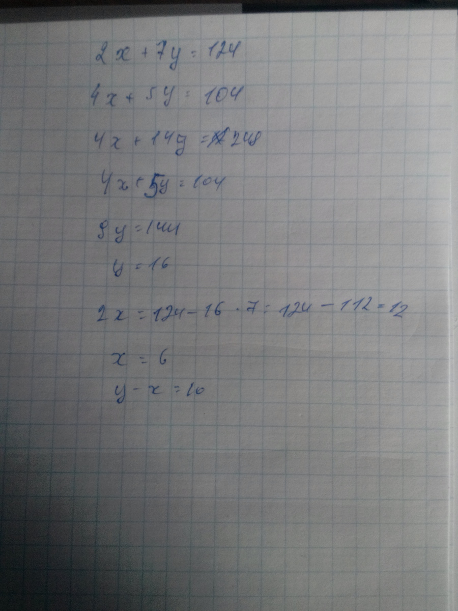 в 2 коробки и 7 ящиков вмещается 124 кг груш а в такие же 4 коробки и 5 ящиков-104 кг груш на сколько вместимость ящика больше вместимости коробки?