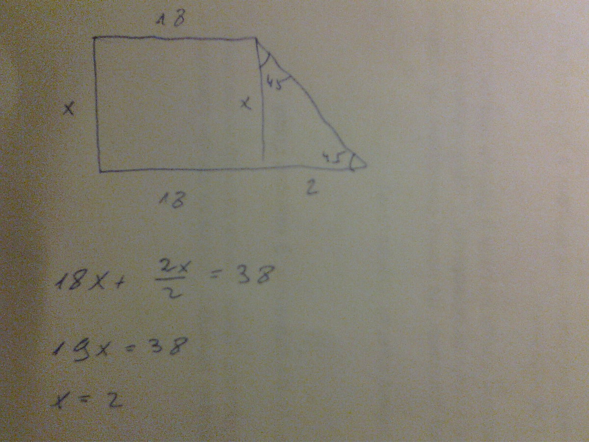 Основания прямоугольной трапеции равны 18 и 20. Ее площадь равна 38. Найдите острый угол этой трапеции. Ответ дайте в градусах.