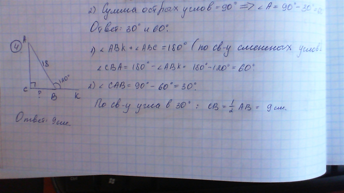 4.В треугольнике АВС угол с=90 градусов, внешний угол при вершине В равен 120градусов, АВ=18 см. Найдите ВС
