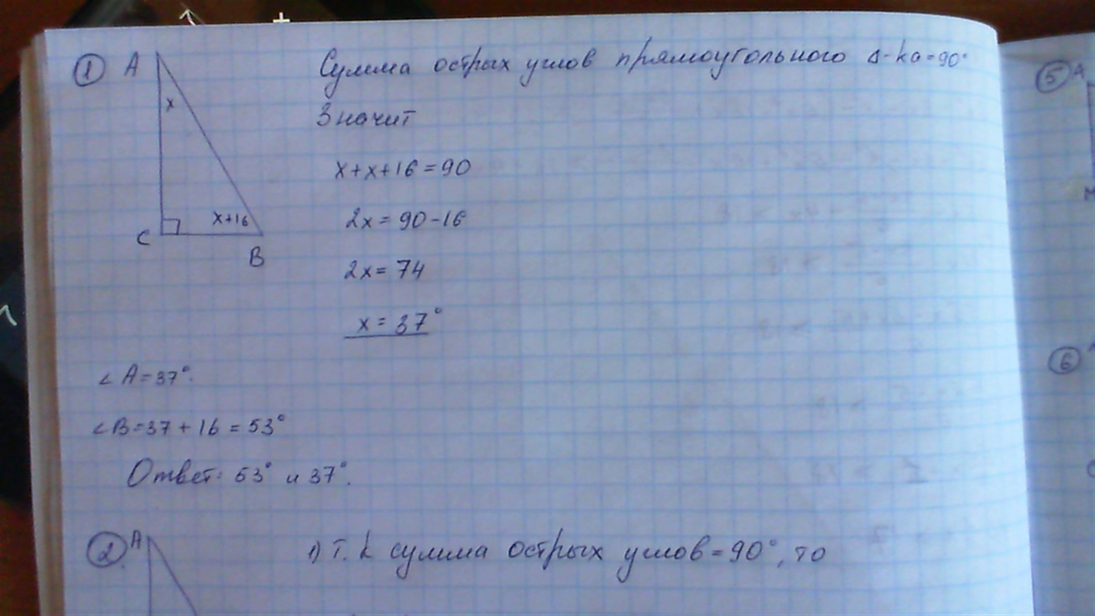 1.Один из углов прямоугольного треугольника на 16градусов больше другого. Найдите эти углы.