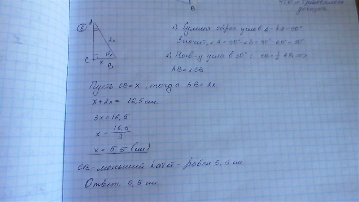 6.Треугольник АВС, угол с=90градусов, уголВ=60 градусов. Сумма гипотенузы меньшего катета равна 16,5см. Найти катет