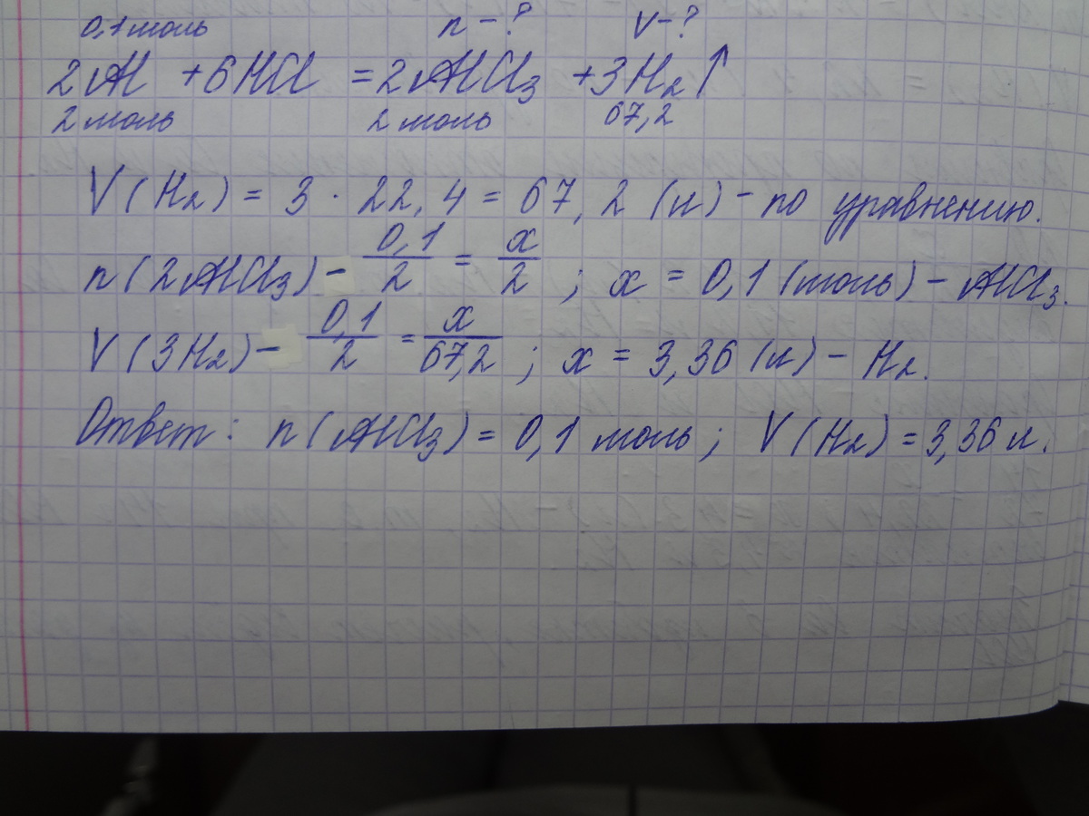 Вычислить, какой объем водорода (н.у.) и какое количество вещества соли образуются при взаимодействии 0,1 моль алюминия с избытком хлоридной кислоты.