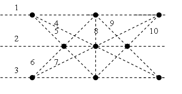 Расположите 9 шашек так,чтобы получилось 10 рядов по 3 шашки в каждом.