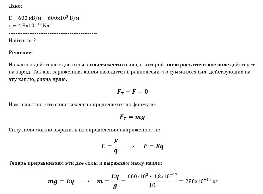 . В плоском горизонтально расположенном конденсаторе заряженная капля ртути находится в равновесии при напряженности поля между плас¬тинами 600 кВ/м. Определить массу капли, если ее заряд 4,8 . 10-17 Кл.
