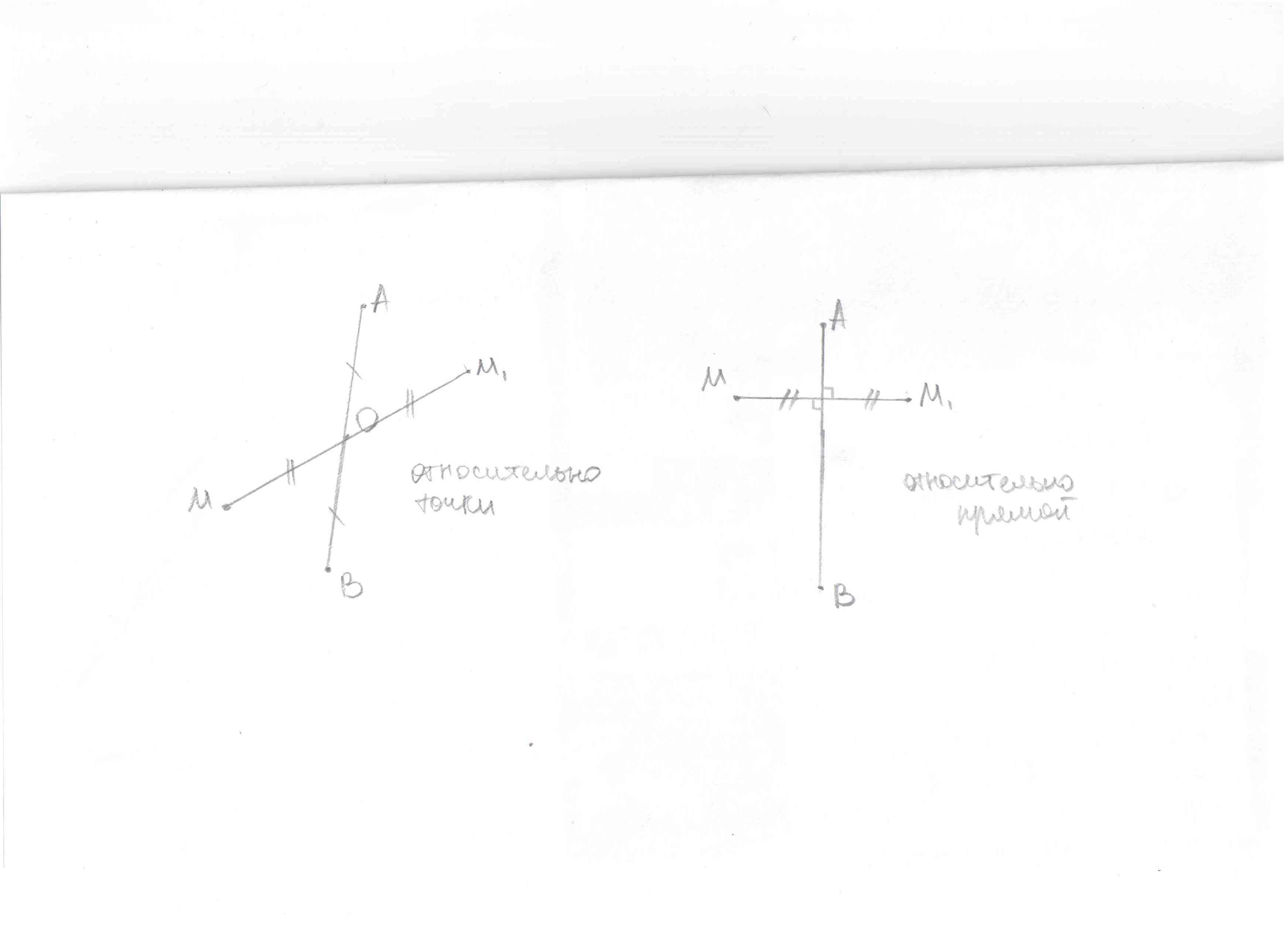 относительно середины отрезка АВ? хм, ну тогда выходит просто симметрия относительно точки, мне кажется. проводишь через М и середину (О) прямую, отмечаешь на ней М1 так, чтобы М1О=МО.