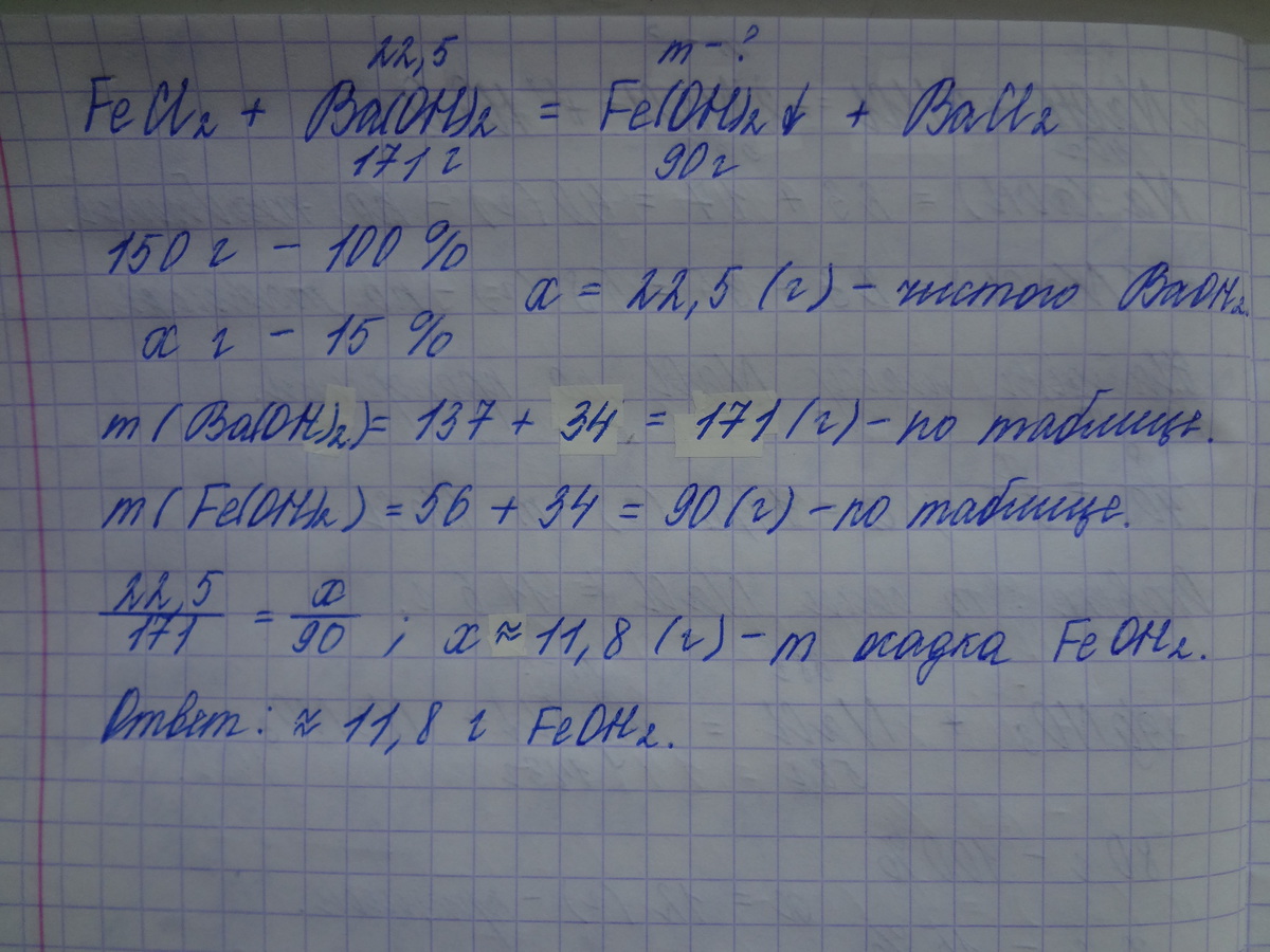 Определите массу осадка опадающий при взаимодействии FeCl2 c раствором гидроксида BaOH массой 150 г. массовой долей 15%