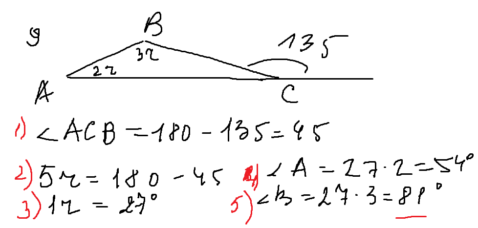9.Внешний угол равен сумме двух других углов треугольника не смежных с ним.