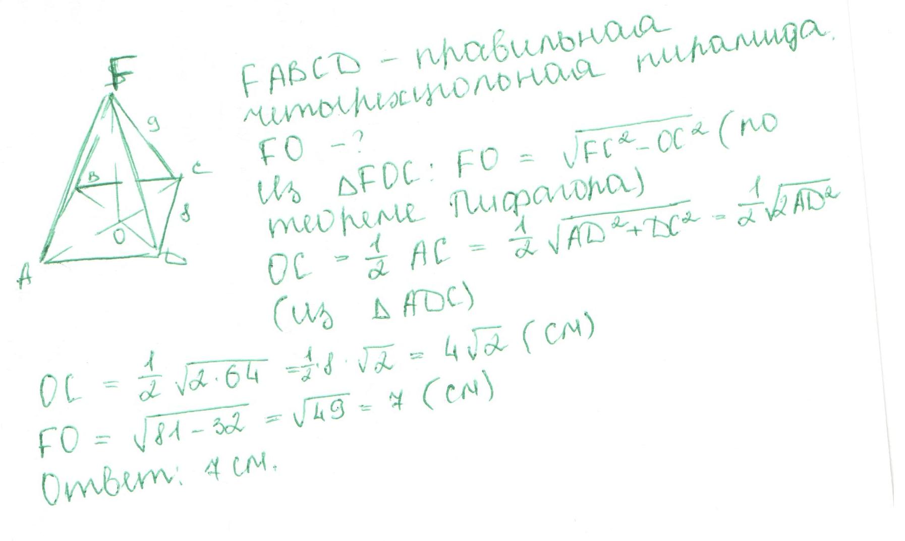 точка F находится на расстоянии 9см от каждой из вершин квадрата АВСD? сторона которого равно 8см. найдите расстояние от точки F до плоскости квадрата.