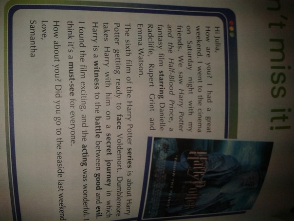 Как ты? У меня были отличные выходные! Я сходила в кино в субботу, ночью, с моими друзьями, Мы смотрели "Гарри Поттер и принц полу-кровка", фильм жанра фэнтези, а в главных ролях Дэниел Редклиф, Руперт Гринт и Эмма Уотсон
