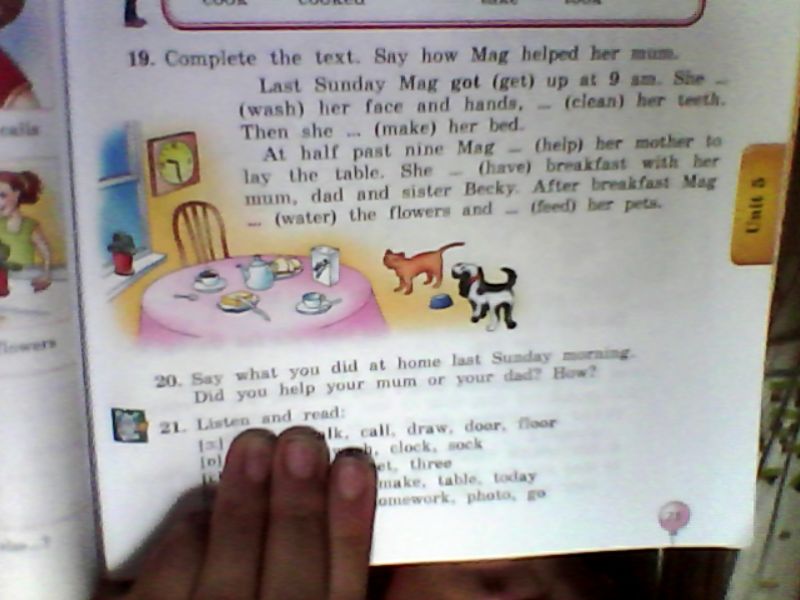 В прошлое воскресенье Маг проснулась в 9 утра,она помыла лицо и руки,почистила зубы.потом она заправила кровать.в половине десятого Маг помогла маме накрыть стол.Потом она позавтракала с мамой,папой и ее сестрой Бэкки.после завтрака она полила цветы и покормила питомцев