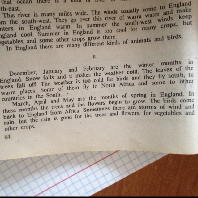 Декабрь, январь и февраль - зимние месяцы в Англии. Падает снег и это делает погоду холодной. Листья деревьев опадают. Погода слишком холодна для птиц, поэтому они улетают на юг, в теплые края. Некоторые из них улетают в Северную Африку и другие страны на Юге. Март, апрель, май - месяцы весны в Англии. В эти месяцы деревья и цветы начинают расти. Птицы возвращаются из Африки в Англию. Иногда весной бывают гроза и дождь, но дождь полезен для деревьев и цветов, для овощей и урожая.