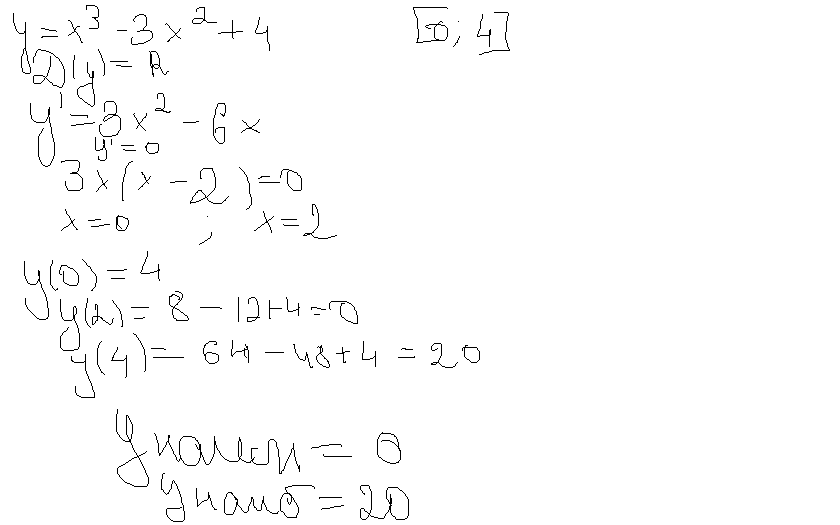 Найдите наибольшее и наименьшее значение функции f(x) = x в кубе - 3x в квадрате + 4 , на промежутке [0;4]