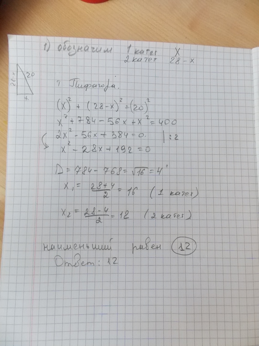В прямоугольном треугольнике сумма катетов 28 см, а гипотенуза 20 см Найти меньший катет треугольника. ПОДРОБНО РАСПИШИТЕ ПЛИСС!