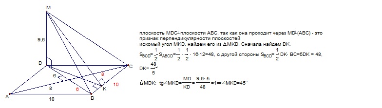 Через вершину Д тупого угла ромба АВСД проведён к его плоскости перпендикуляр ДМ равный 9,6 .Диагонали ромба равны 12 и 16 . Вычислите величину угла между плоскостями а) АВС и МДС, б)АВС и СВМ