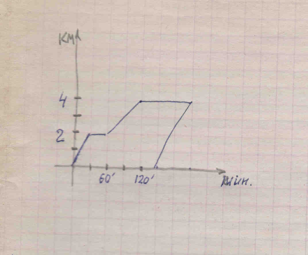 В 3А класе решено было провести зимнюю экскурсию. В 10 часов утра ребята вышли из школы и пошли со скоростью 4 км/ч. За полчаса они дошли до леса и остановились, чтобы узнать глубину снега. Там они пробыли полчаса и пошли дальше со скоростью 2 км/ч. Пройдя час, они остановились, чтобы повесить кормушки и поиграть. Они отдыхали полтора часа, а затем тронулись в обратный путь со скоростью 4 км/ч. Еще через час они вернулись в школу уставлие, но довольные (1 кл.- 30 мин, 1 кл.- 1 км)