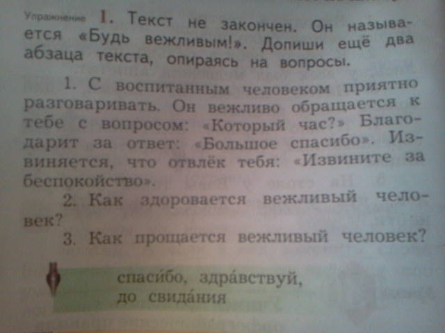Ребята помогите .русский 2 класс.Текст не закончен.Он называется Будь вежливым.Допиши ещё два абзаца текста опираясь на вопросы.Смотрите фото ниже.Помогите пожалуйста это завтра уже нисти.