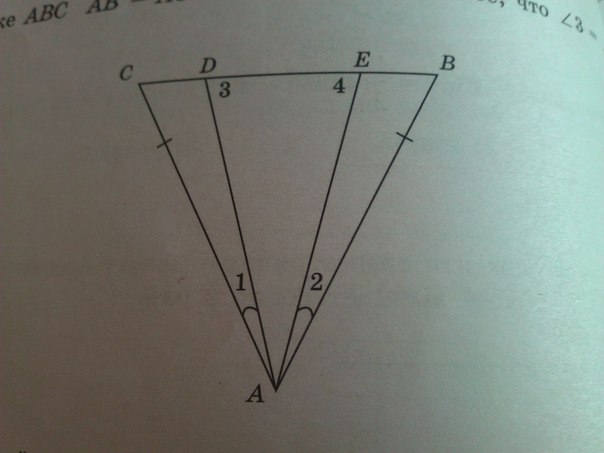 если треугольник равнобедренный, то В=С, угол 3=1+ С, как внешний для треуг АСД, аналогично, 4=2+В. Значит 3=4 как суммы соответственно равных углов.