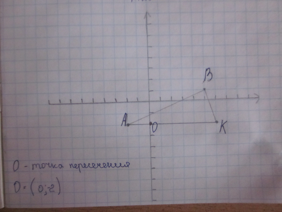 Постройте треугольник АВК по координатам его вершина А ( - 2; - 2), В ( 1; 5), К ( 6; -2). Найдите координаты точки пересечения стороны АК с осью ординат.