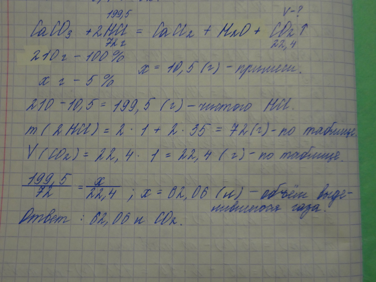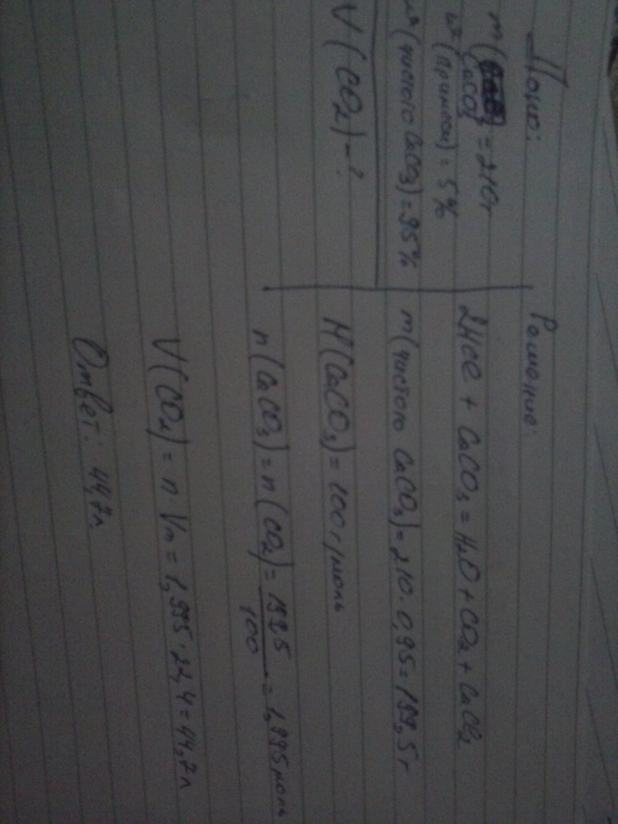 объем газа ,выделившегося при взаимодействии раствора соляной кислоты с 210 г известняка ,содержащего 5% примесей ,составляет ..
