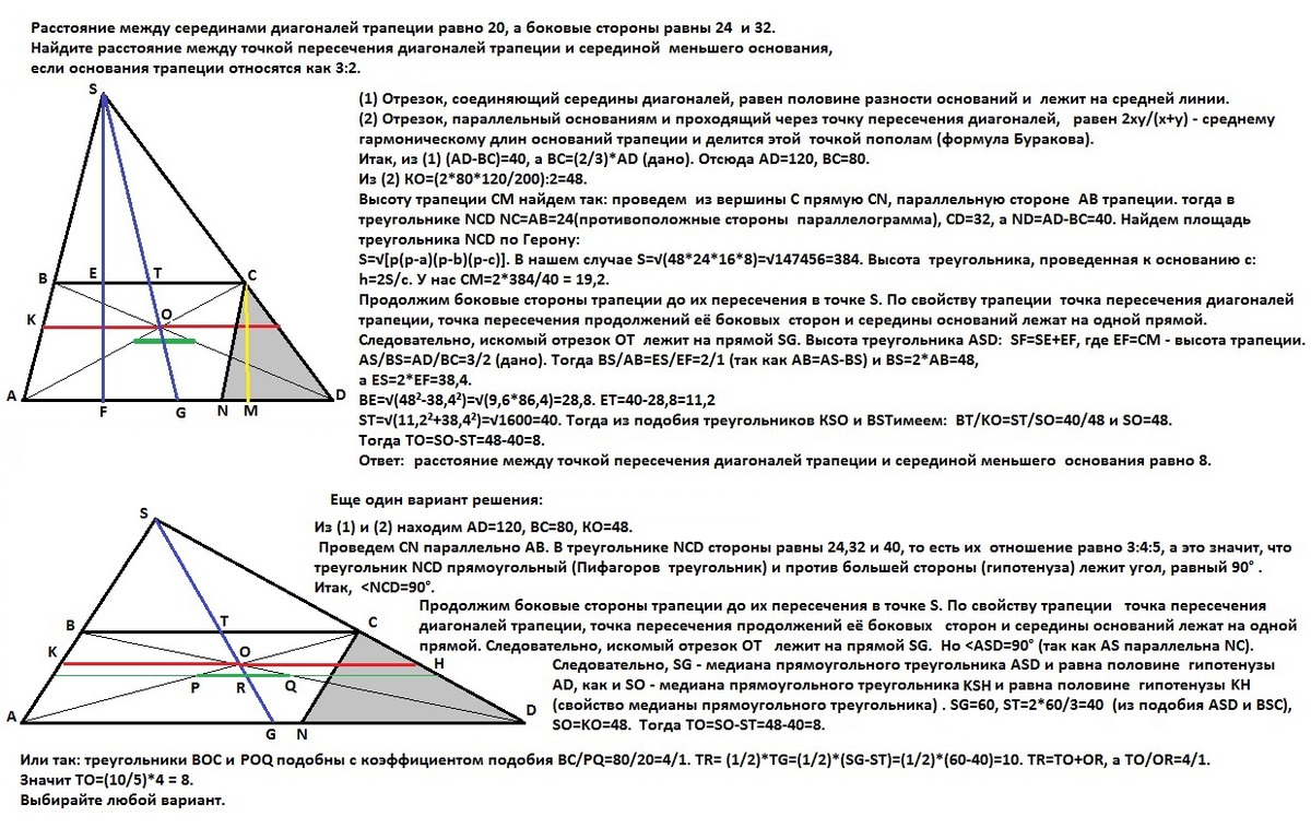 Расстояние между серединами диагоналей трапеции равно 20, а боковые стороны равны 24 и 32. Найдите расстояние между точкой пересечения диагоналей трапеции и серединой меньшего основания, если основания трапеции относятся как 3 : 2.