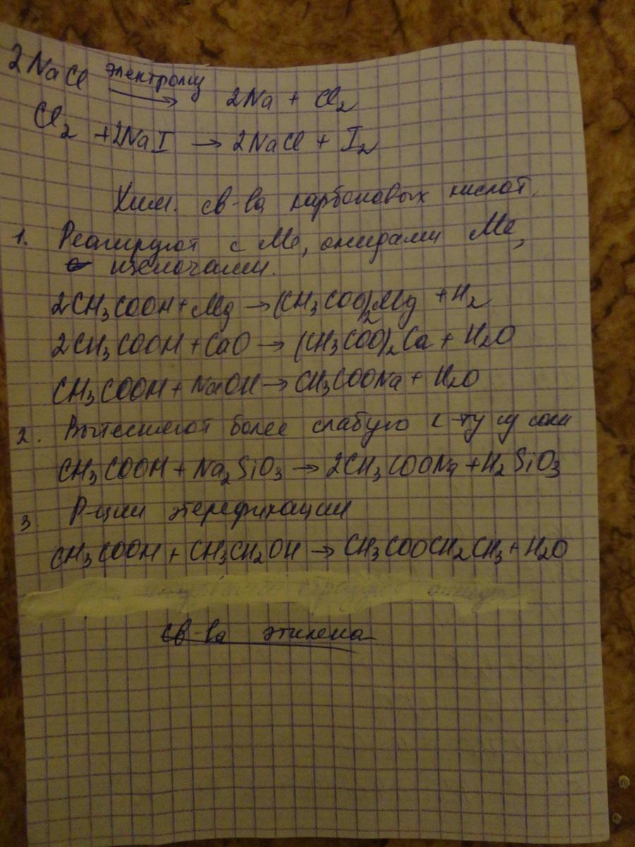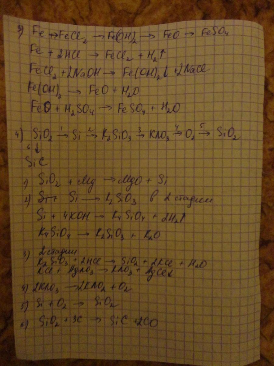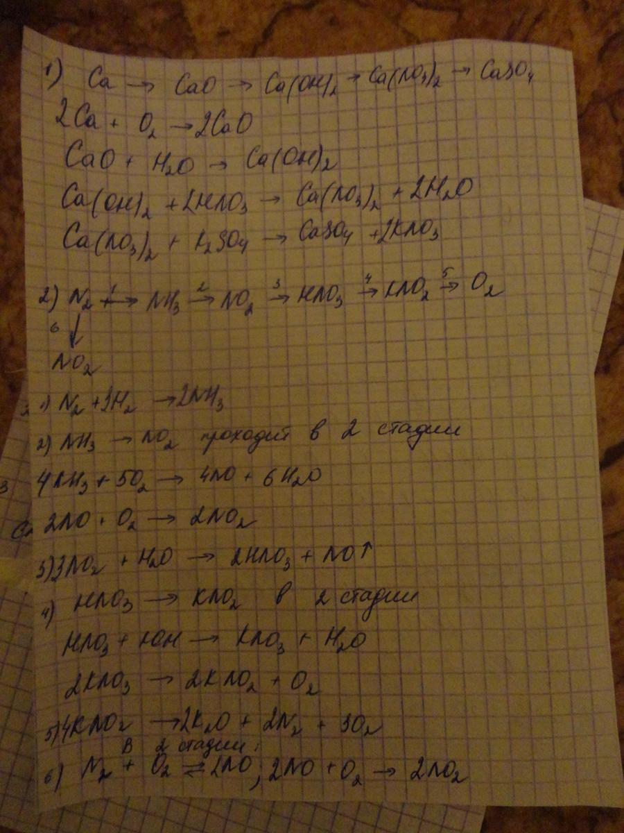 напишите пож-та превращение завтра контр.раб. (((заранее спасибо)))) 1)написать преврвщения Ca →CaO →Ca(OH)2 →Ca(NO3)2 →CaSO4 N2 →NH3→ NO2 →HNO3 →KNO2→ O2 ↓ NO2 Fe →FeCl2 →Fe(OH)2→ FeO →FeSO4 SiO2 →Si →K2SiO3 →KNO3 →O2 →SiO2 ↓ SiC Al2(SO4)3 ∕ Al→ Al2O3→ AlCl3 →Al(OH)3 NaAlO2 NaCl→ HCl →H2 →H2S→ SO2 →SO3→ H2SO4 →H2S ↓ Cl2→J2 2) Химические свойства:карбоновых кислот, этилена