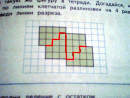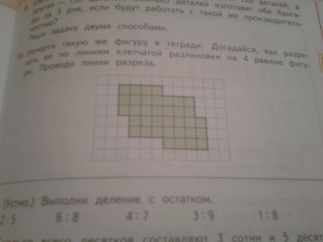 Начерти такую же фигуру в тетради. Догадайся, как разрезать ее по линиям клетчатой разлиновки на 4 равные фигуры. Проведи линии разреза. Помогите плиз.