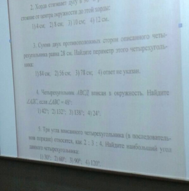4)Сумма противолежащих сторон вписанного четырехугольника равна 180 градусов. если один угол 48 градусов, значит другой угол 180-48=132 градуса