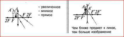 Построить изображение предмета в собирающей и рассеивающей линзах, если предмет находится на расстоянии между F и 2F, между F и линзой. 4 рисунка.