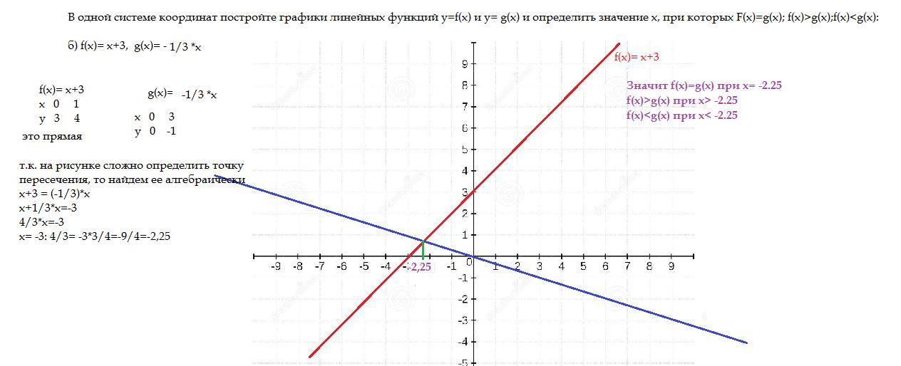 B одной системе координат постройте графики линейных функций у=f(x) и y= g(x) и определить значение х, при которых F(x)=g(x); f(x)>g(x);f(x)<g(x):
