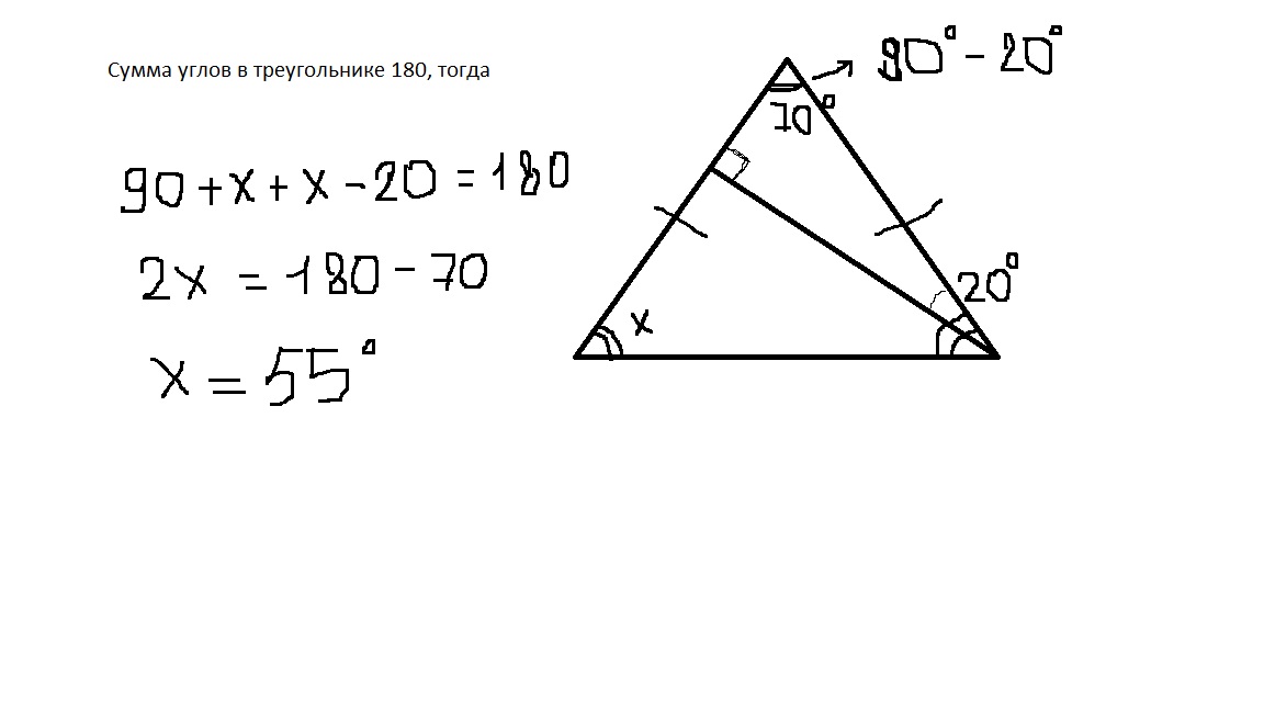 Высота равнобедренного треугольника, проведённая к его боковой стороне , образует с другой боковой стороной угол 20 градусов. Найдите угол при основании равнобедренного треугольника