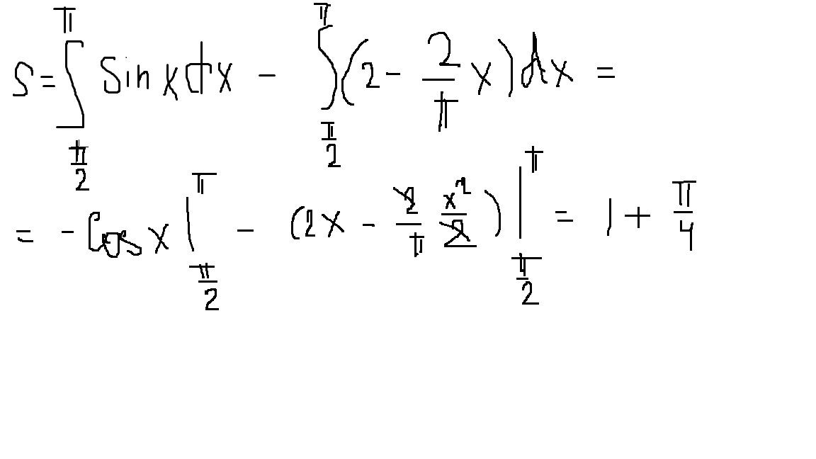 Найти площадь фигуры , ограниченной графиком функции y=sinx , определенной на отрезке (0;пи) и прямой ,проходящей через точки m (пи/2;1) и n(пи;0).