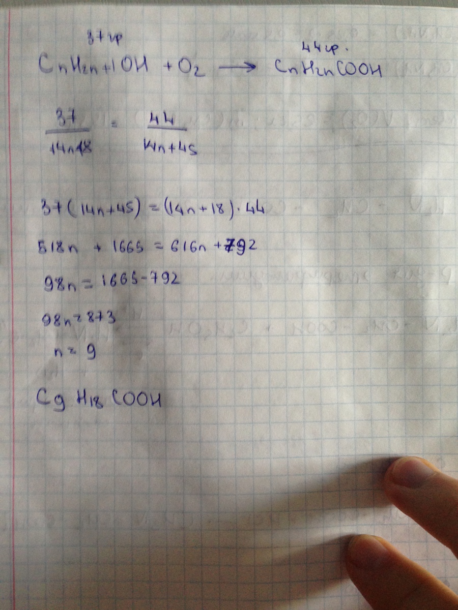 При окислении 37 г первичного спирта получено 44 г монокарбоновой кислоты с тем же числом атомов углерода. Определить молекулярную формулу кислоты