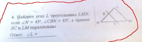 Найдите угол L треугольника LMN если угол N=45 градусов, угол CBN=85 градусов а прямые ВС и LM параллельны