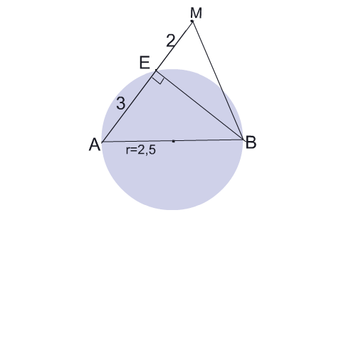 через точки М вне окружности и через точку А-конец диаметра ,АВ проведена прямая пересекающая окружность в точке Е , АЕ=3 , МЕ=2 , радиус 2.5 найити S треугольника амв срочно ребят,пожалуста