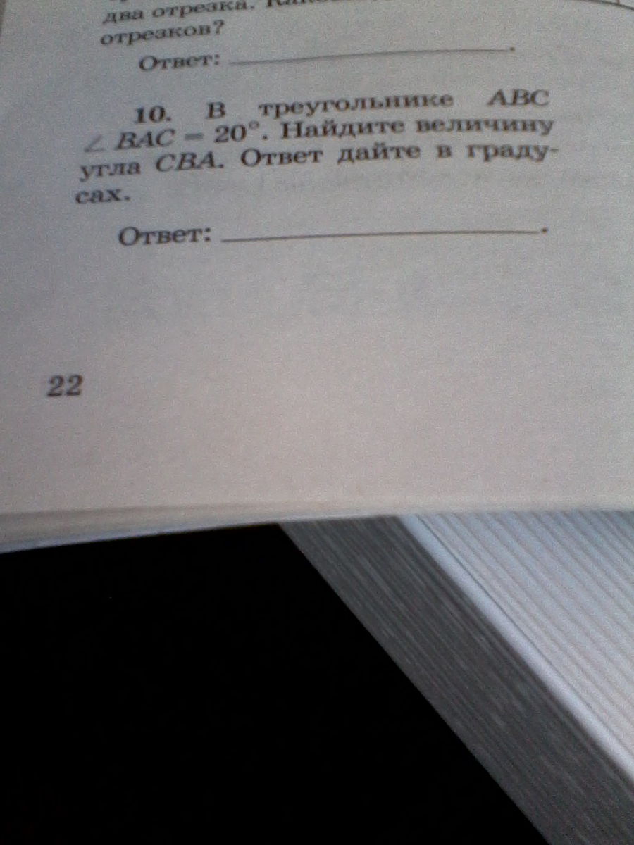 в треугольнике ABC угол BAC=20градусам.найдите величину угла CBA.ответ дайте в градусах.