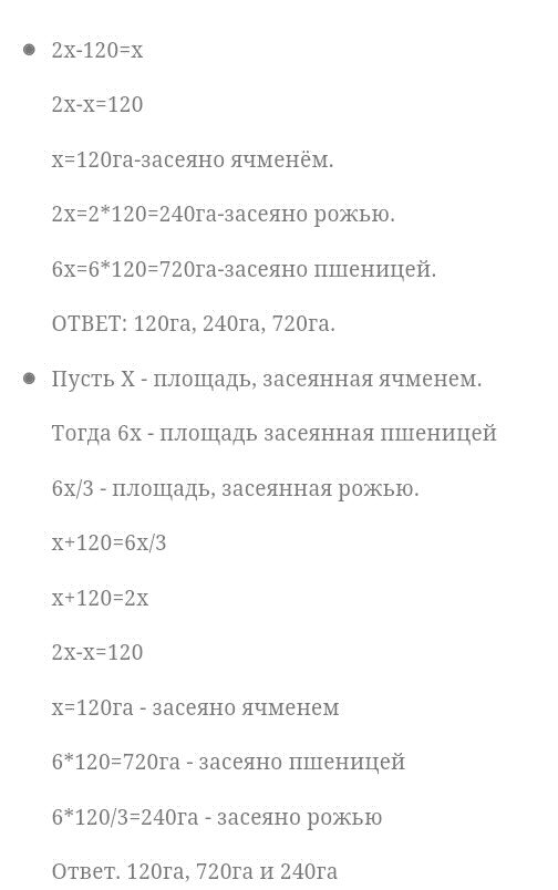 Площадь земли,засеяно пшеницей,в 6раз больше площади,засеяной ячменем з а площадь , засеянная пожьюю , в 3 раза меньше плрщади,засеянной пшеницей.Сколько гектаров земли засеяно каждой культуроц,если рожью засеяно на 120 га больше,чем ячменем?