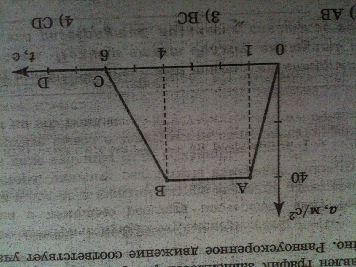 На рисунке представлен график зависимости ускорения от времени для тела,движущегося прямолинейно.Равноускоренное движение соответствует участку 1)OA 2)AB 3)BC 4)CD