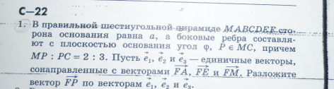 Заданы единичные вектора вдоль FA (это e1), FE (это e2), FM (это e3), выразим через них вектора. Для этого надо просто длину вектора умножить на нужный единичный вектор.