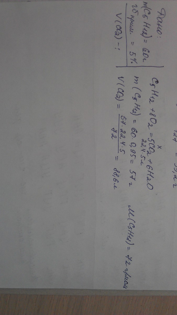 Рассчитайте объем углекислого газа, который образуется при горении 60 г пентана, содержащего 5% негорючих примесей