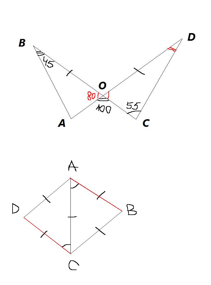 1)Дано ВО=DO;угол АВС=45 градусов; угол BCD=55 градусов ; угол АОС=100 градусов.