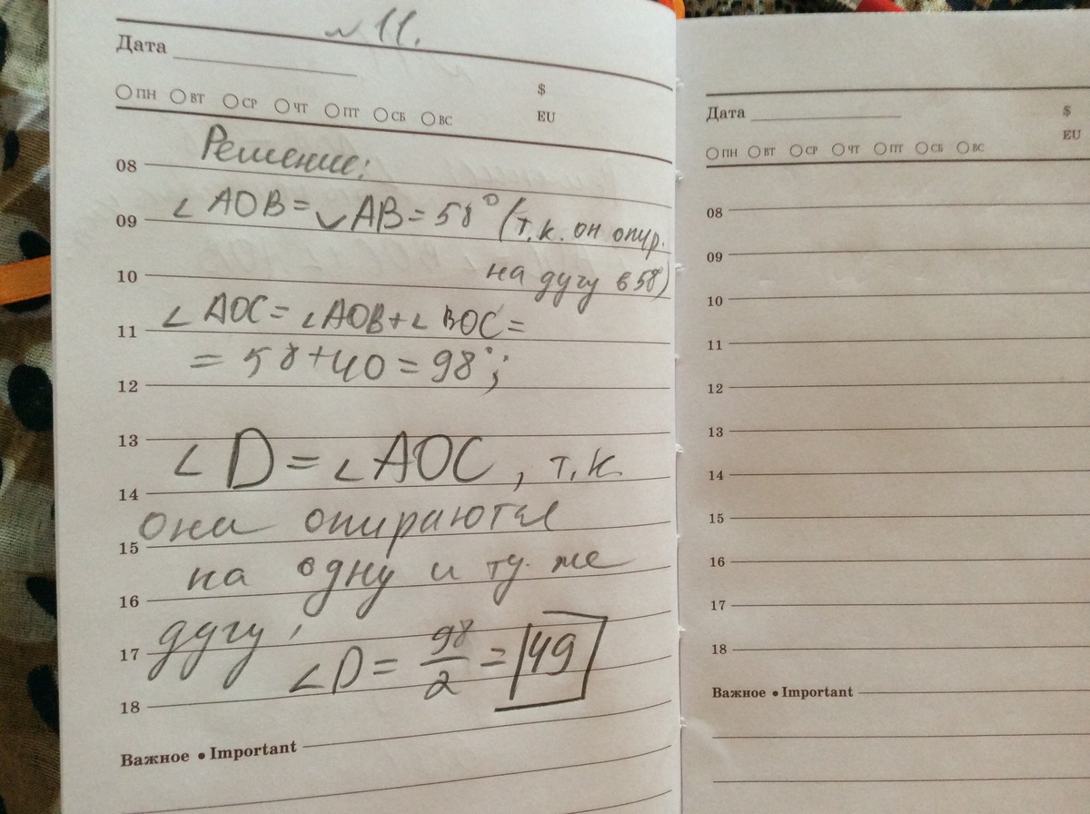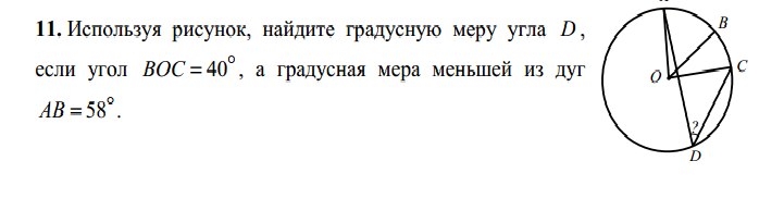 Используя рисунок, найдите градусную меру угла D, если угол BOC=40, а градусная мера меньшей из дуг AB=58