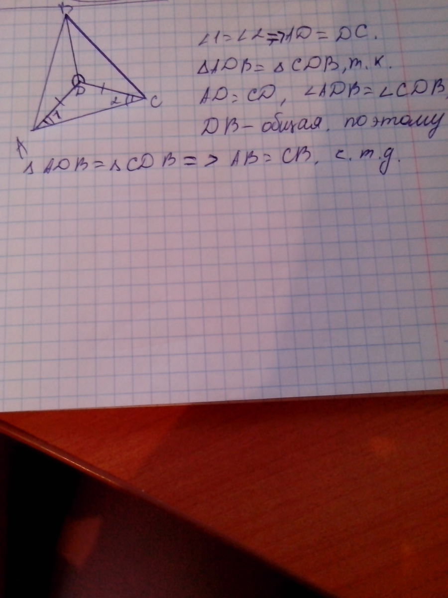 Внутри треугольника АВС взята точка D так,что угол ВDА=углу ВDС,угол DАС=углу DСА.Докажите,что треугольник АВС-равнобедренный