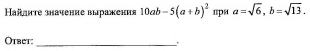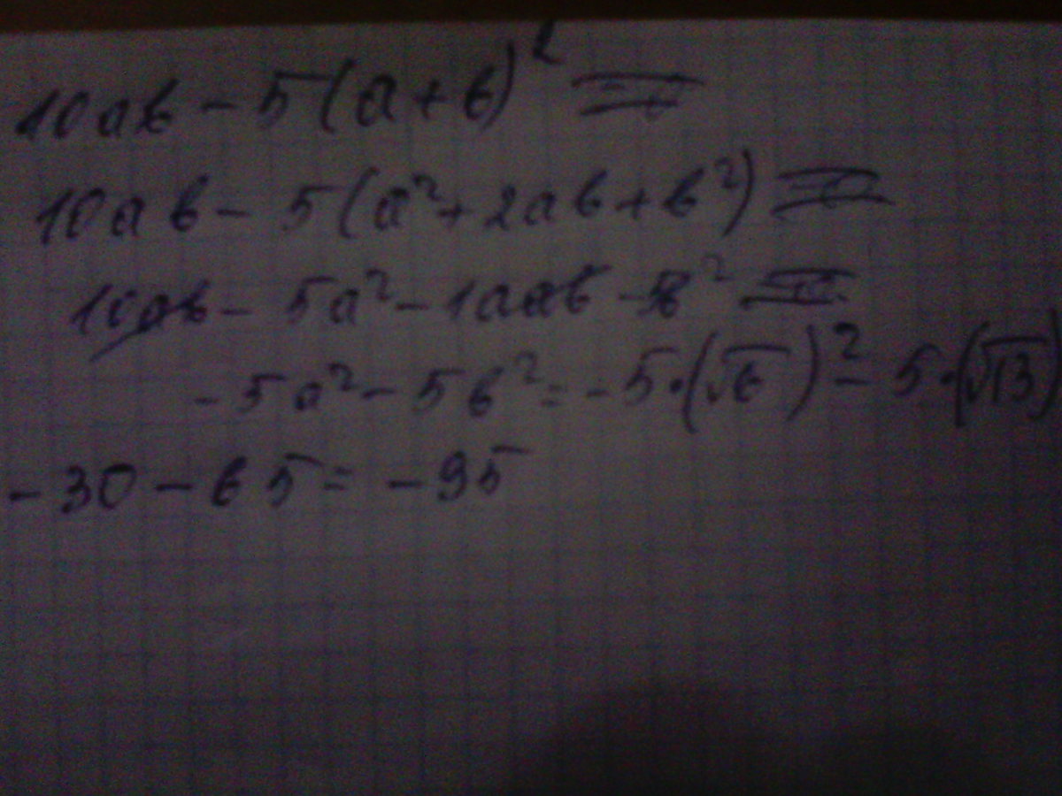 10ab - 5(a+b)^2=10ab -5(a^2+2ab+b^2)= 10ab-5a^2-10ab-5b^2= -5a^2-5b^2= -5(корень из 6)^2 -5(корень из 13)^2= -30-65= -95