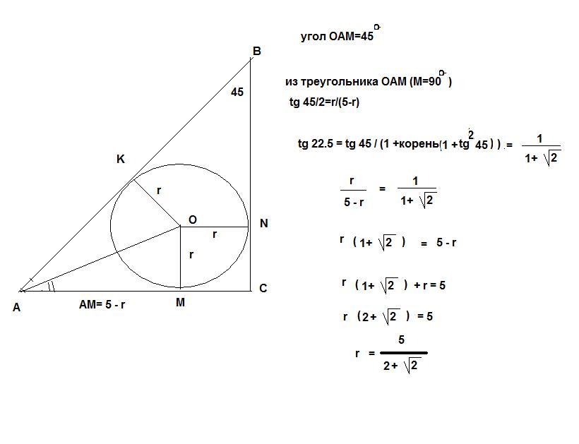знайти радіус кола якщо катет вписаного в нього прямокутнього трикутника =5см а прилеглий до нього =45 градусів знайти радіус