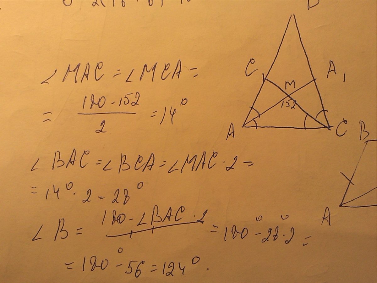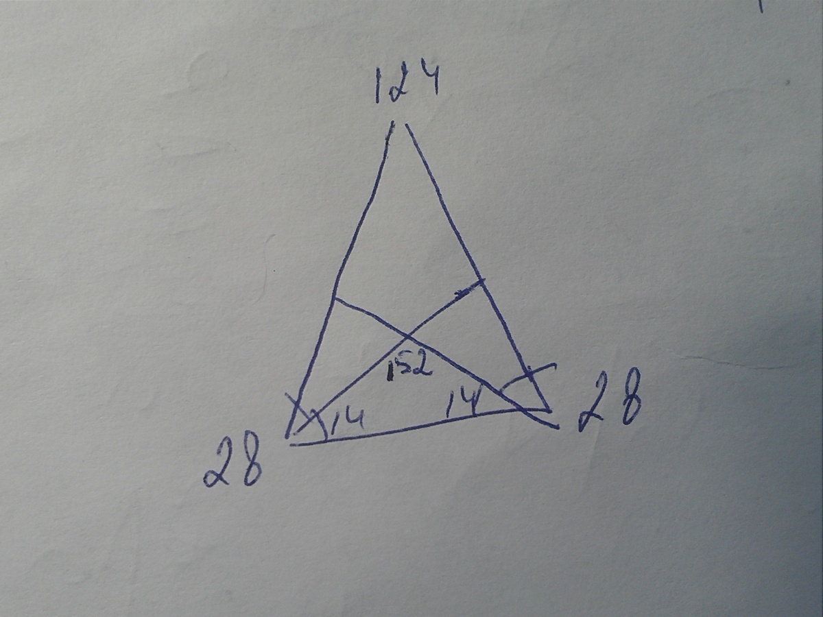 В равнобедренном треугольнике биссектриса углов при основании образует при пересечении угол,равный 152 груса . Угол при вершине этого треугольника равен?
