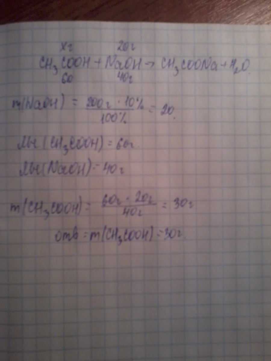 вычиcли массу уксусной кислоты которая может прореагировать с раствором гидроксида натрия массой 200г с массовой долей NaOH 10%