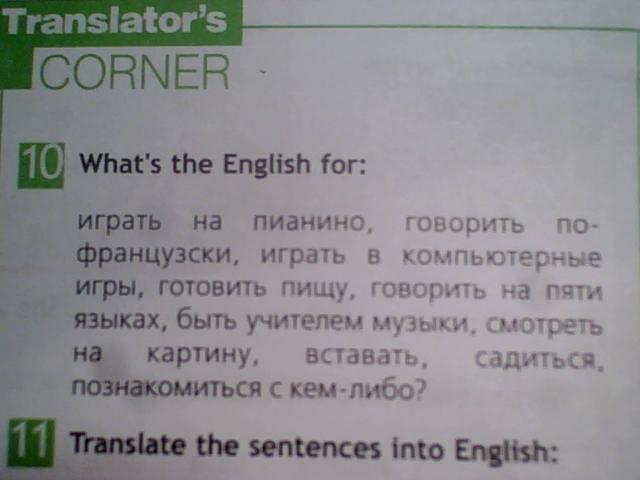 play the piano, speak French. playing computer games, cook, speak five languages, to be a teacher of music, look at the picture. to get up. sit down to meet with anyone?На английский