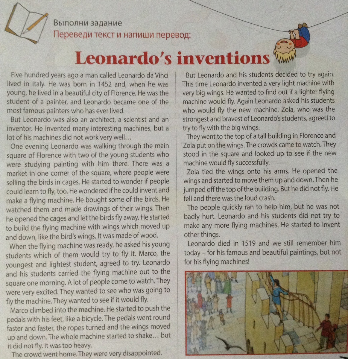 Изобретений ЛеонардоПятьсот лет назад человек по имени Леонардо да Винчижил в Италии . Он родился в 1452 году и , когда он былмолодой, он жил в прекрасном городе Флоренции. Он былстудент художник , и Леонардо стал одним изсамых известных художников , кто когда-либо жили .Но Леонардо был также архитектор, ученый иизобретатель. Он изобрел много интересных машин, ноМногие из его машин не работают очень хорошо ...Однажды вечером Леонардо шел по главнойплощади Флоренции с двумя из молодых студентов, которыеизучали живопись с ним там. БылРынок в одном углу площади , где люди былипродажи птиц в клетках . Он начал удивляться, если людиможет научиться летать , тоже. Он задавался вопросом , может ли он придумать исделать летательный аппарат . Он купил некоторые из птиц. оннаблюдал за ними и делал рисунки крыльев . затемон открыл клетки и пусть птицы улетают. Он началпостроить летательный аппарат с крыльями , который перешели вниз , как крылья птичьих . Он был сделан из дерева.Когда летательный аппарат был готов , он спросил его молодойстудентов, которые из них будут пытаться летать . Марко,молодой и легкий студент, согласился попробовать . Леонардои его ученики несли летательный аппарат , чтобыплощадь однажды утром . Много людей приходят смотреть . онибыли очень взволнованы . Они хотели посмотреть , кто собиралсяпокупать машину . Они хотели посмотреть, если он будет летать .Марко забрался в машину. Он начал толкатьпедали с ноги , как на велосипеде . Педали обошелвсе быстрее и быстрее , канаты повернулся и крылья переехали down.The вся машина начало трясти ... ноэто не летать. Это было слишком тяжелым.Толпа пошла домой. Они были очень разочарованы.Но Леонардо и его ученики решили попробовать еще раз .На этот раз Леонардо изобрел очень светлый машину сочень большие крылья . Он хотел узнать, если легче летает машина будет летать . Опять Леонардо попросил своих студентовкто будет покупать новую машину . Золя , который был сильный и храбрый студентов Леонардо , согласилсяпопробовать летать с большими крыльями .Они пошли в верхней части высотного здания во Флоренции и Золя поставить на крыльях . Толпы пришли посмотреть . онистоял на площади и поднял голову и увидел , если новаямашина полетит успешно .Золя связали крылья на его руках. Он открыл крылья и начал перемещать их вверх .Он спрыгнул с верхней части здания . Но он не летал . онупал и был громкий треск .Люди быстро побежал , чтобы помочь ему , но он не был тяжело ранен . Леонардо и его ученики не пытался сделать больше летательные аппараты . Он начал придумывать другое.Леонардо умер в 1519 году , и мы до сих пор помню его сегодня - за его известных и красивых картин , но неза его летательных аппаратов !это перевод