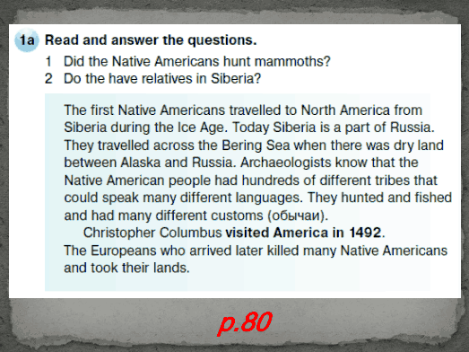 Первые коренные американцы прибыли в Северную Америку из Сибири во время Ледникового периода. Это сегодня Сибирь - часть России. Они перебрались по Беринговому морю, когда там был ещё только кусок суши между Аляской и Россией. Археологи открыли, что у коренных американцев были сотни разных племён, которые говорили на разных языках. Они охотились, рыбачили, у них были разные обычаи.